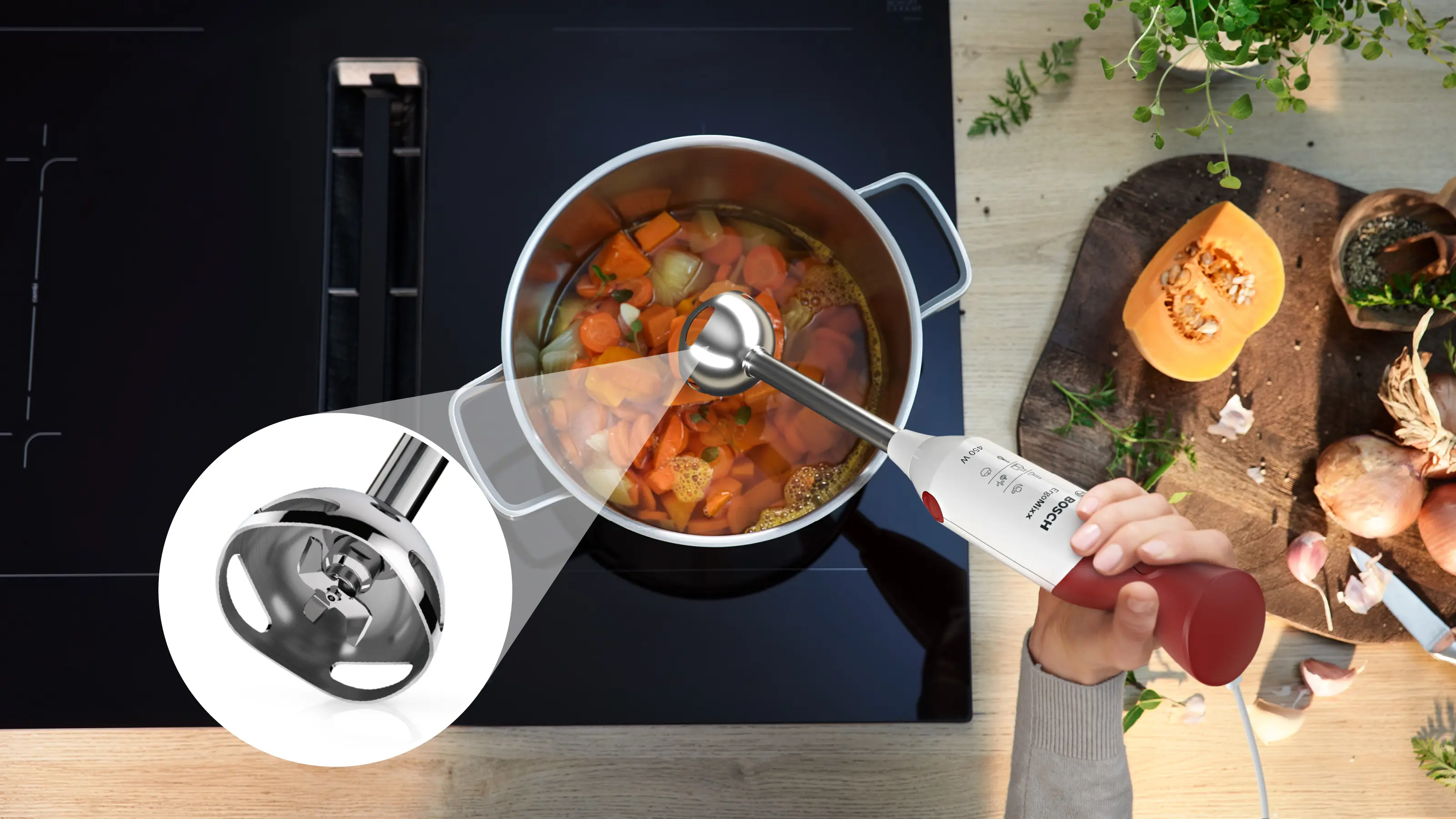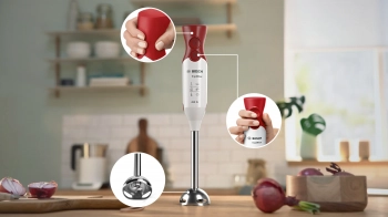 Patentovaný Bosch "Click - mechanismus" umožnuje snadné sejmutí mixovací nohy a příslušenství