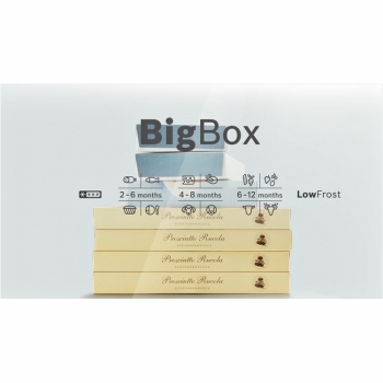 Zásuvka na hluboce zmražené potraviny pro praktické uspořádání již zmražených potravin nebo potravin o velkém objemu, např. dortů nebo pizz. Nezáleží na tom, zda musíte zajistit narozeniny pro své děti nebo zmrazit svatební dort. V zásuvce Big Box najdete dostatek místa pro velké mražené potraviny.