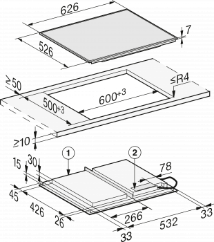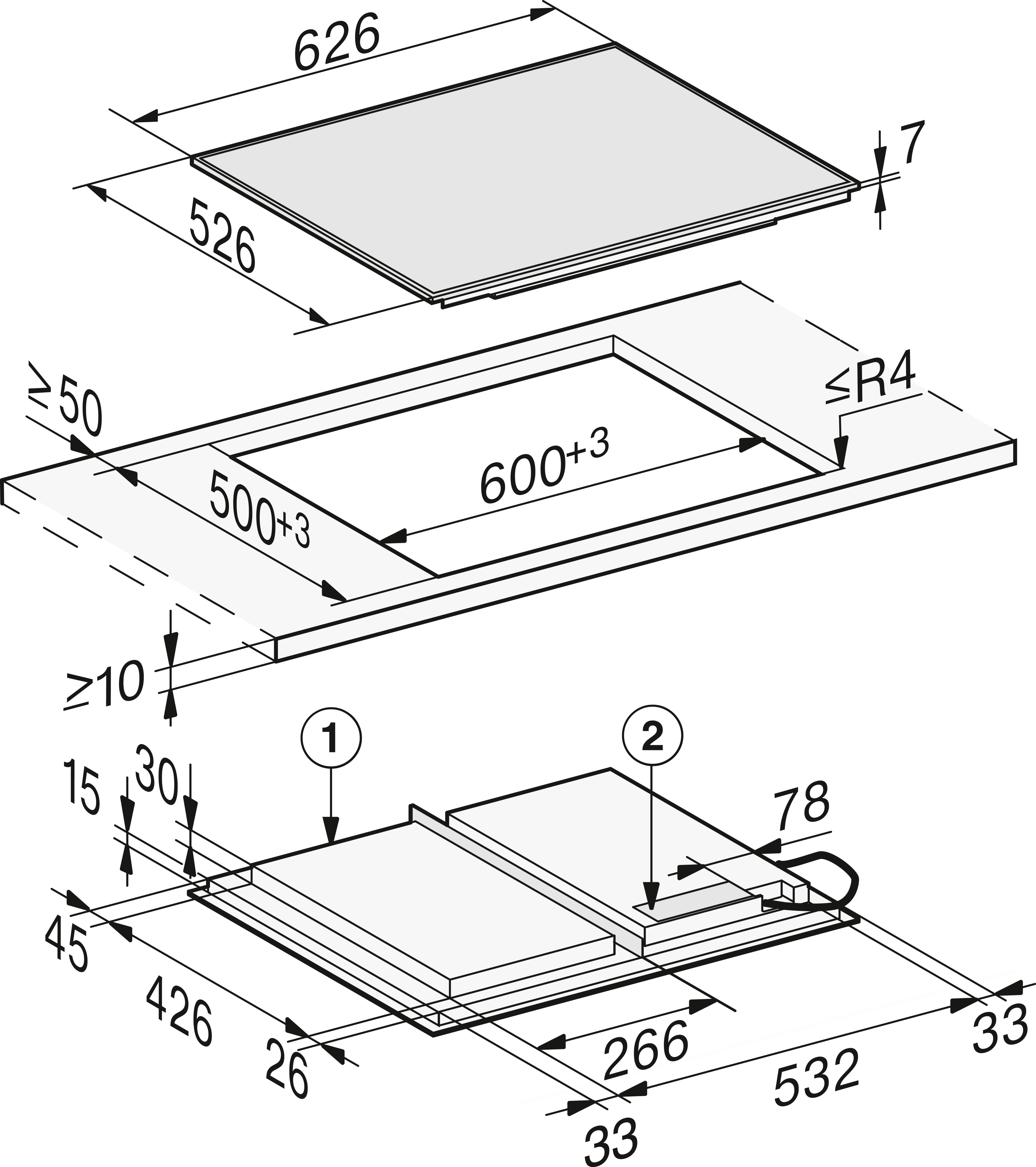 Rozměry výřezu v mm (hloubka) při instalaci bez rámu 500