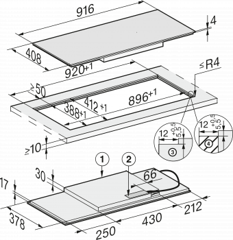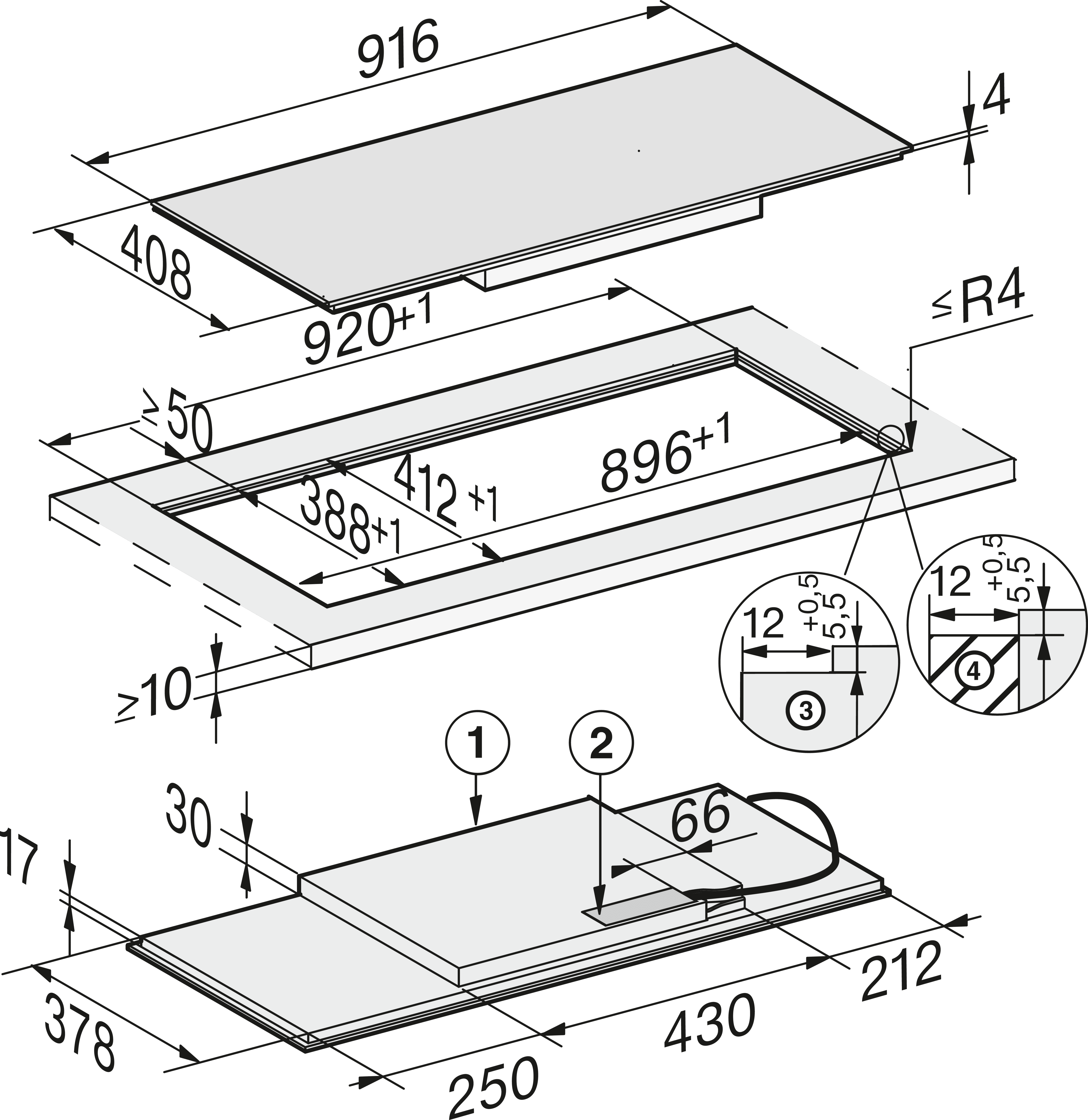 V šířce 916mm pro instalaci nad pracovní deskou nebo pro zapuštění