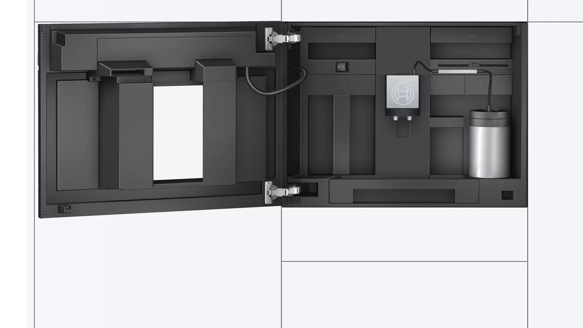 Voda, mléko a nádoba fazole jsou snadno přístupné skrývá za dveřmi, takže v kuchyni vždy uklizeno
