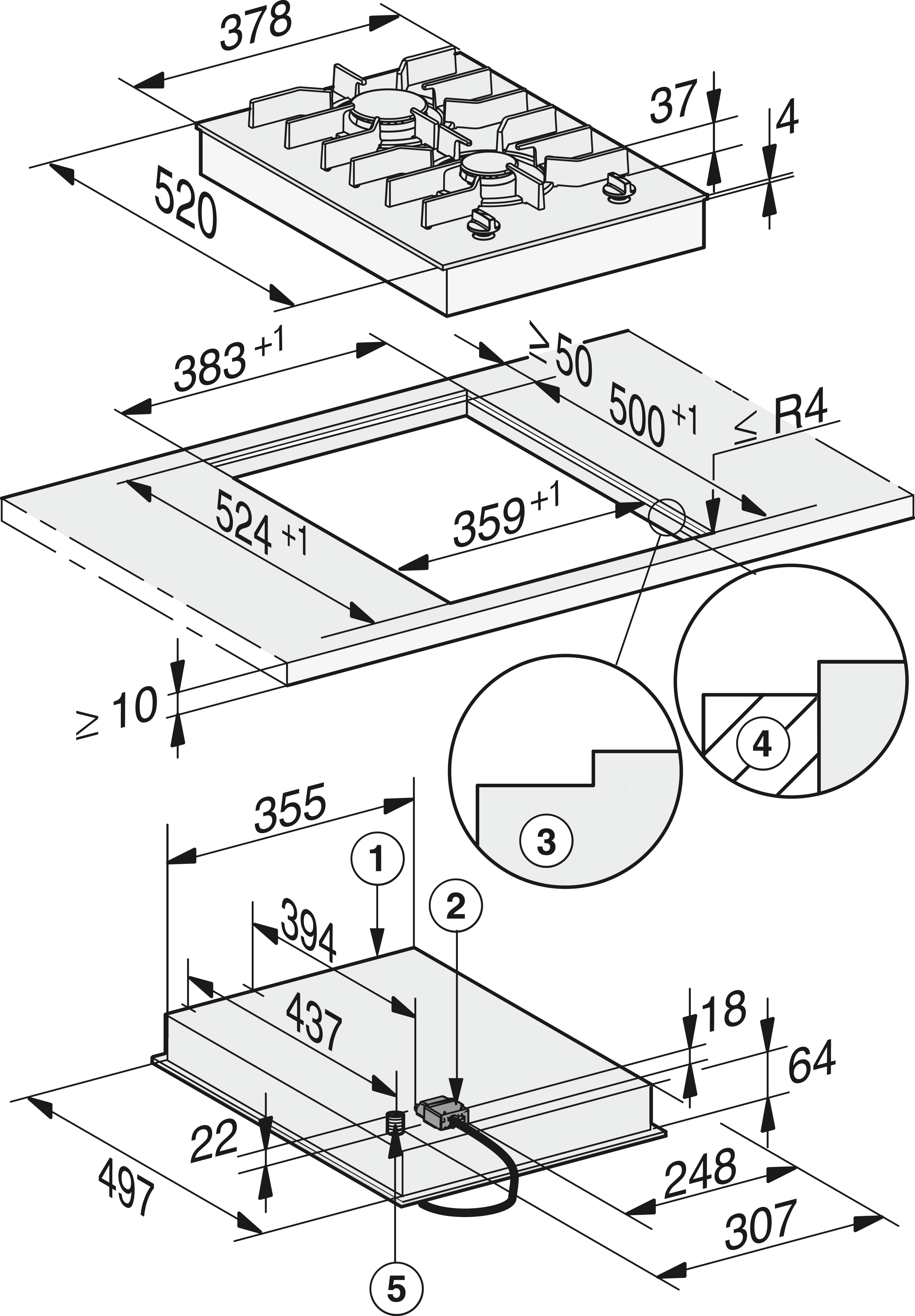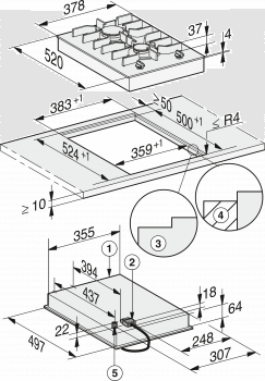 Vnější rozměr výřezu v mm (hloubka) při instalaci se zapuštěním 524