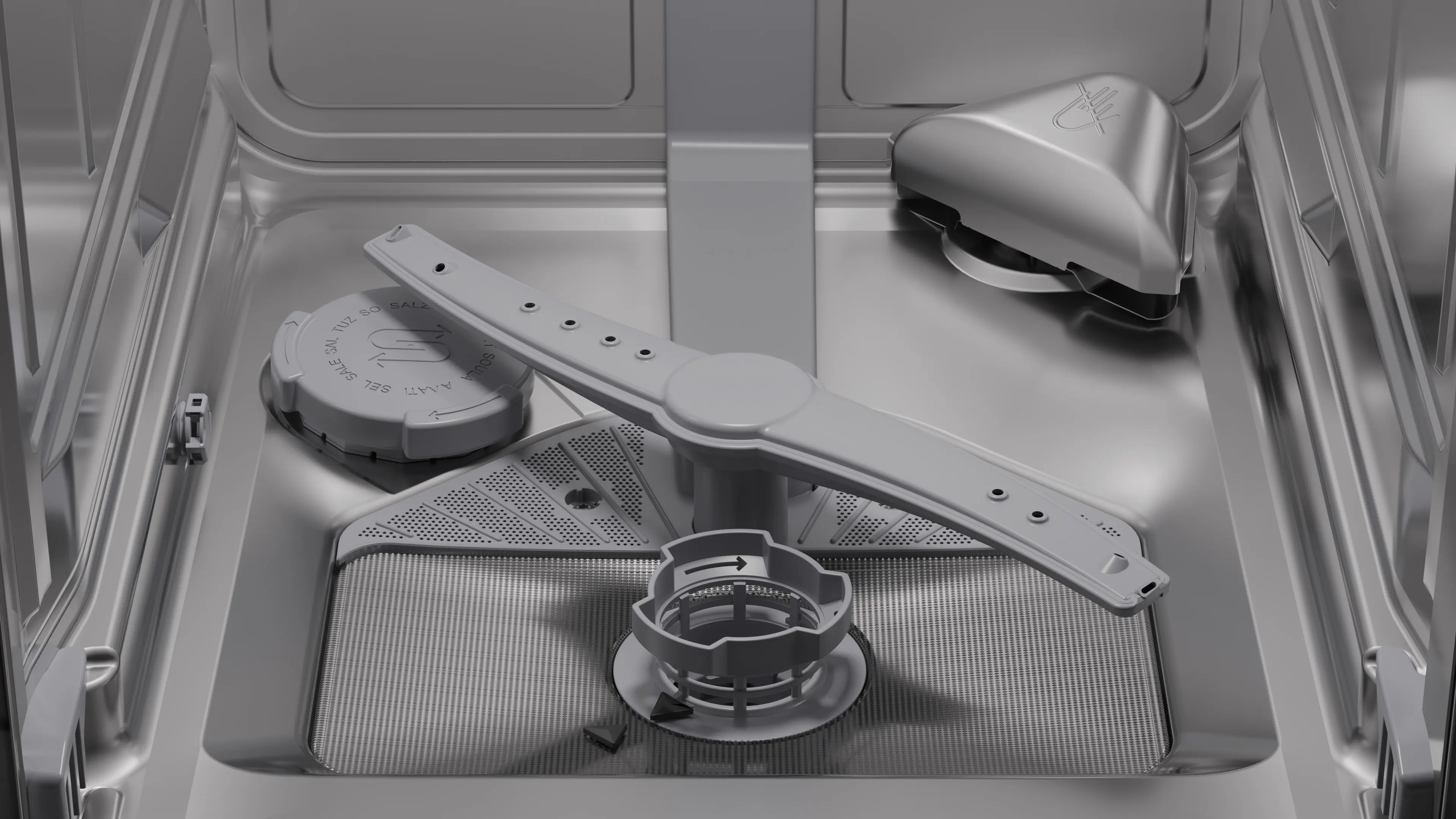 Dávkovací asistent zajišťuje optimální výsledky díky účinnému rozpouštění mycích tabletDávkovací asistent zaručuje optimální mycí výsledky a tišší mytí. Čisticí prostředek se přesune ze zásobníku na čisticí prostředky do speciální záchytné misky v horní části koše, kde se zcela rozpustí. | ![]() |