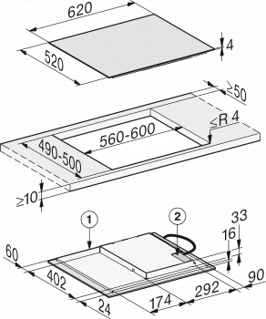 Rozměry výřezu v mm (hloubka) při instalaci bez rámu na pracovní desku 490