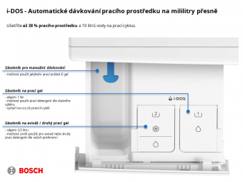 ![]() | i-DOS je systém, který šetří prací prostředekŠetřte vodu šetřením pracího prostředku. Jedinečný inteligentní systém dávkování pracího prostředku i-DOS určí přesné množství tekutého pracího prostředku. V automatickém programu speciální senzory zjistí váhu prádla a typ tkaniny a dokonce i stupeň znečištění. Vaše prádlo se vypere s optimálním množstvím čisticího prostředku. Pokud se vyhnete jeho nadměrnému používání, zabráníte také, aby další prací cyklus odstranil mýdlový povlak z pracího prostředku. Pomocí systému i-DOS ušetříte tekutý čisticí prostředek a až 7 062 litrů vody. To je potenciální roční úspora při použití systému i-DOS namísto běžného domácího praní s manuálním dávkováním a běžným programem pro citlivé prádlo při průměrném počtu 220 cyklů praní. |