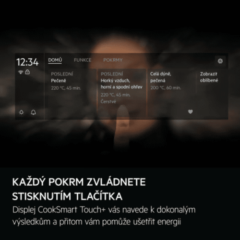 Možnost elektronického nastavení trouby: 14 Multi Step Cooking Functions, 25 Languages / Textdisplay, Display Full colour TFT touch 7.8 inches 16 x 5, 167 Variety of pre-set cooking programmes Assist, ovládání aplikací, automatické vypnutí (jen trouby), 5 Cleaning programs (steam cleaning, steam cleaning plus, descaling, drying, rinsing), akustický signál, nastavení hlasitosti minutky, Check Result (Finish Assist by remaining 10% duration) (Use residual heat screen + beep), elektronická regulace teploty, Electronical door switch, výběr rychlého předehřátí, jídelní sonda, Dětský zámek, minutka pro čištění, konektivita, čas vaření, demo program s kódem, nastavení jasu disp., čas vaření s odhadem konce, přičítání času, Clock automatic adjustment, Clock style in standby (2 versions: digital, 7 segments), denní čas, nastavení tvrdosti vody, automatické vypnutí jídelní sondy, jídelní sonda - indikace teploty jádra, jídelní sonda s odhadem času, tóny kláves, alarmů a chyb, aktivace/deaktivace (kromě hlavního vypínače), Oven light on/off selectable (2 ways: menu, direct access on home screen), Preheating (none, eco, fast), hlavní vypínač, denní paměť 3 dny zpětně, minutka, OTA programming (excluding power board), Short cut keys in standby screen, doporučená teplota, ukazatel teploty (°C), ukazatel zbytkového tepla, Residual heat usage (only with duration), info k servisu