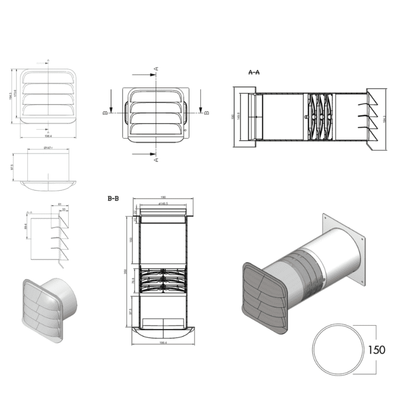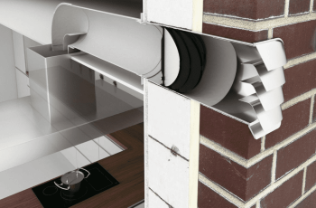 Teleskopická stěnová příruba s Thermoboxem a venkovní nerezovou žaluzií. Aerodynamicky tvarované směrové lamely žaluzie E-Jal Col zabezpečují optimální odvod vzduchu.