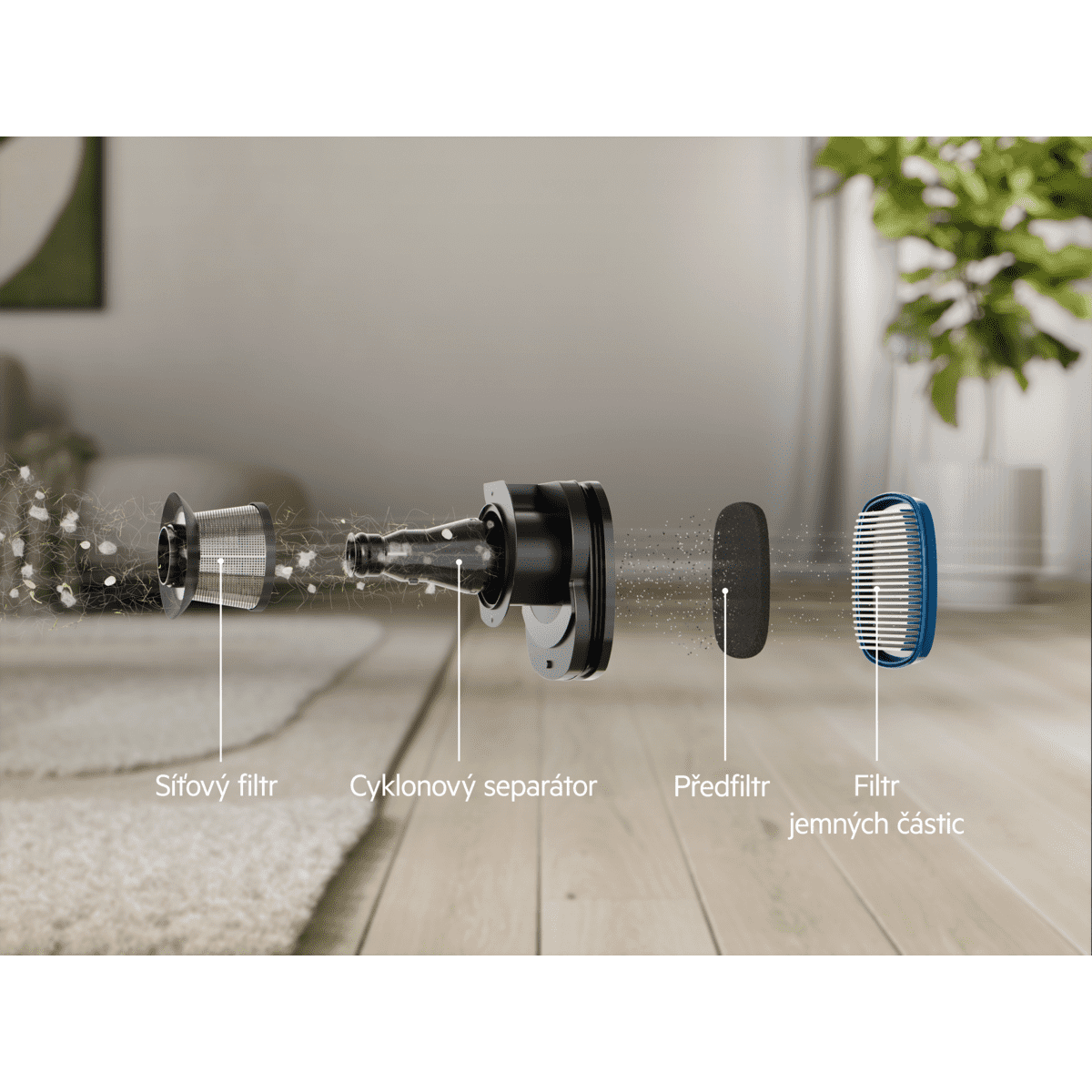 | Systém cyklonového filtru | Výkonnější ventilátor motoru a o 50 % větší skládaný filtr s dvojitou filtrací zlepšují výkon vašeho vysavače. |