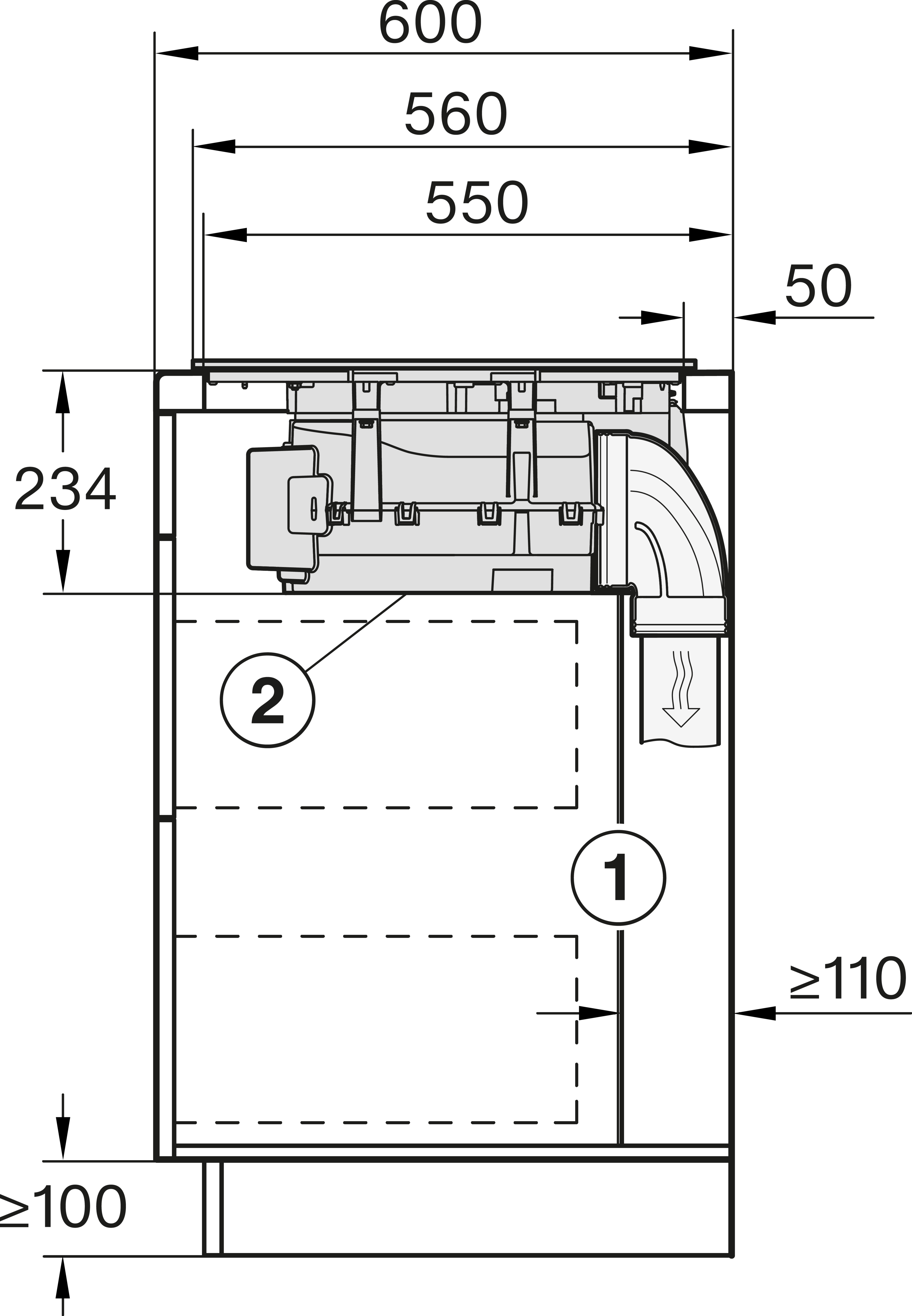 Vnitřní rozměr výřezu v mm (hloubka) při instalaci se zapuštěním do pracovní desky 500