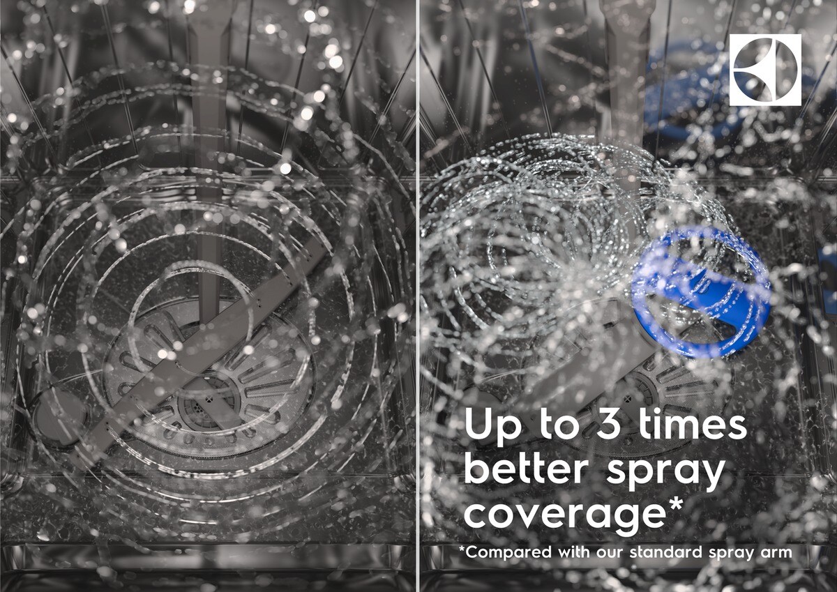 Satelitní sprchovací rameno SatelliteClean® zanechá vaše nádobí perfektně čisté a beze skvrn. Naše technologie má až třikrát lepší pokrytí při sprchování, dokonce i v případě, že je nádobí naskládáno těsně u sebe. Voda se dostane do každého koutu i v přeplněné myčce.