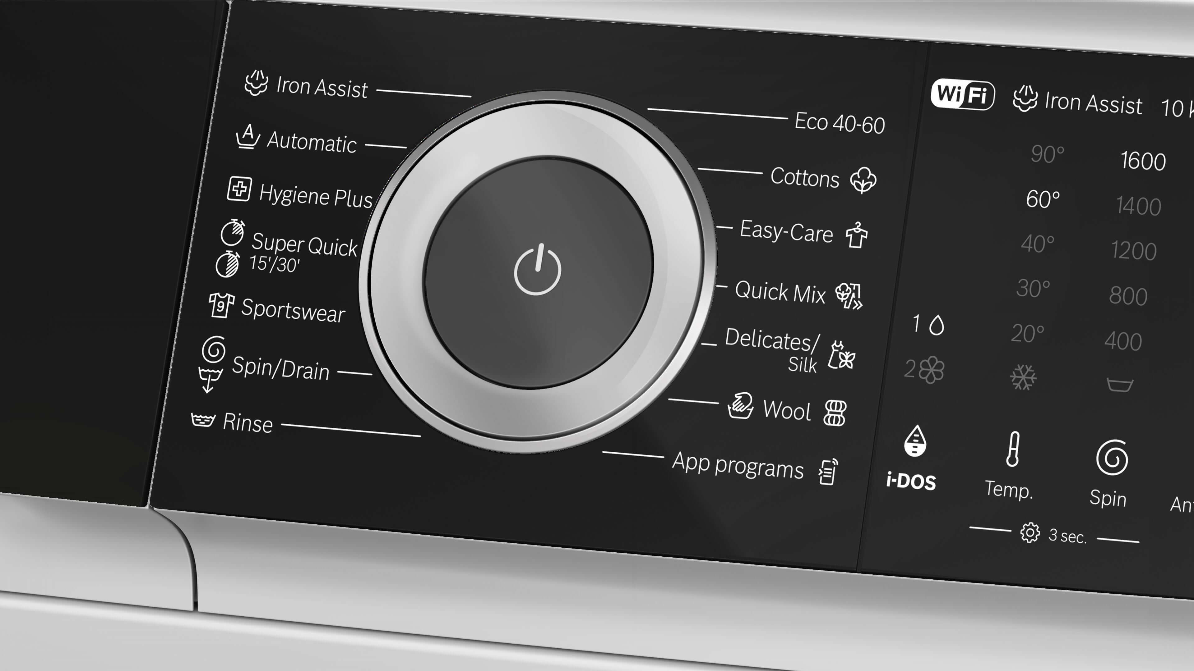 speciální programy: další programy přes aplikaci, automatický program pro jemné prádlo, Iron Assist, Hygiena Plus, odstřeďování/odčerpání, rychlý/mix, sport/fitness, máchání, super rychlý 15/30