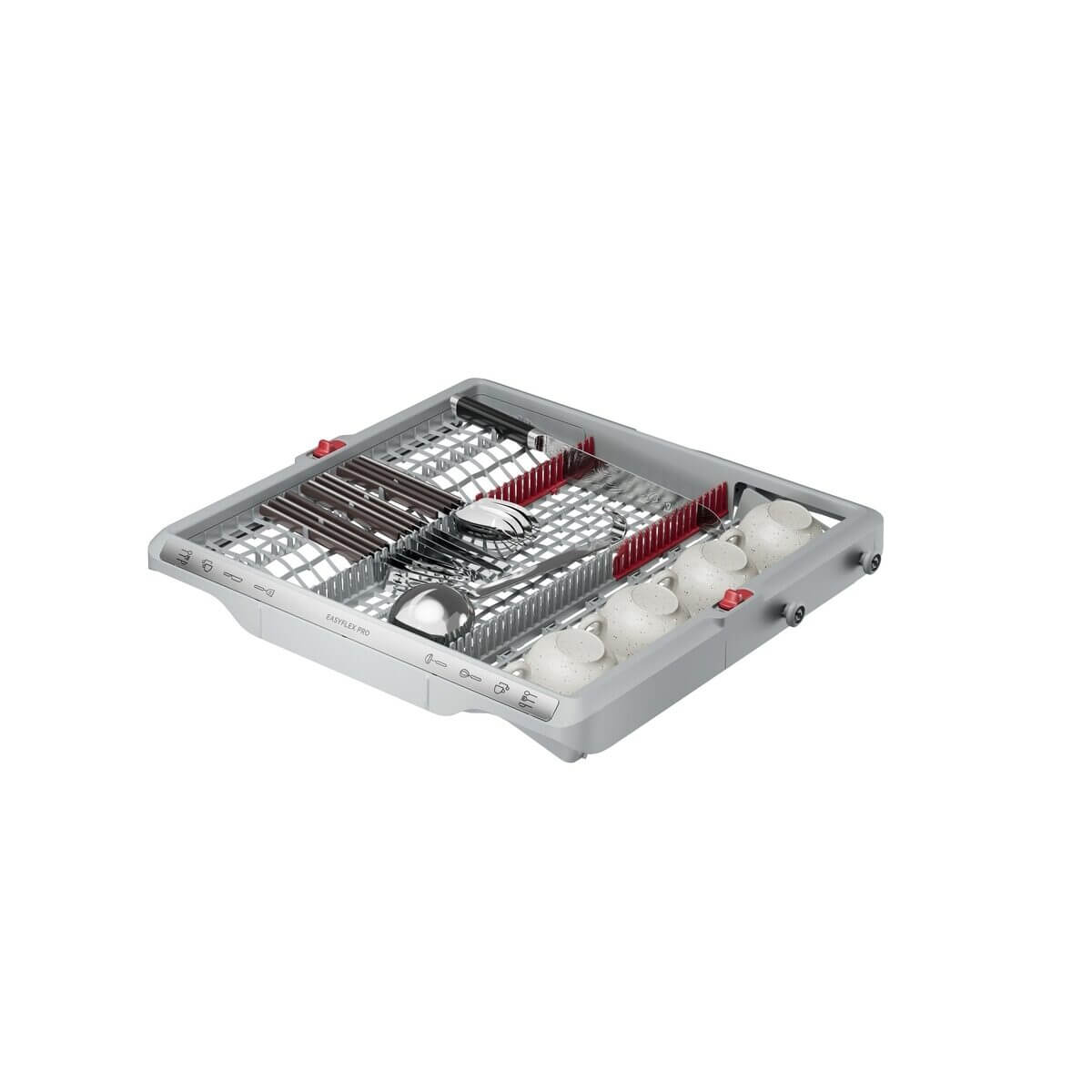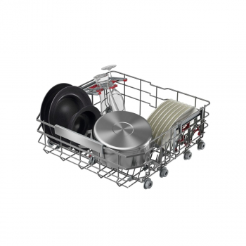 Dolní košík má 4 front foldable tines with tine caps, 4 rear foldable tines with tine caps, glasscare support for wine and beer glasses, oven tray support, Nerezové držadlo, Tall flat rack frame