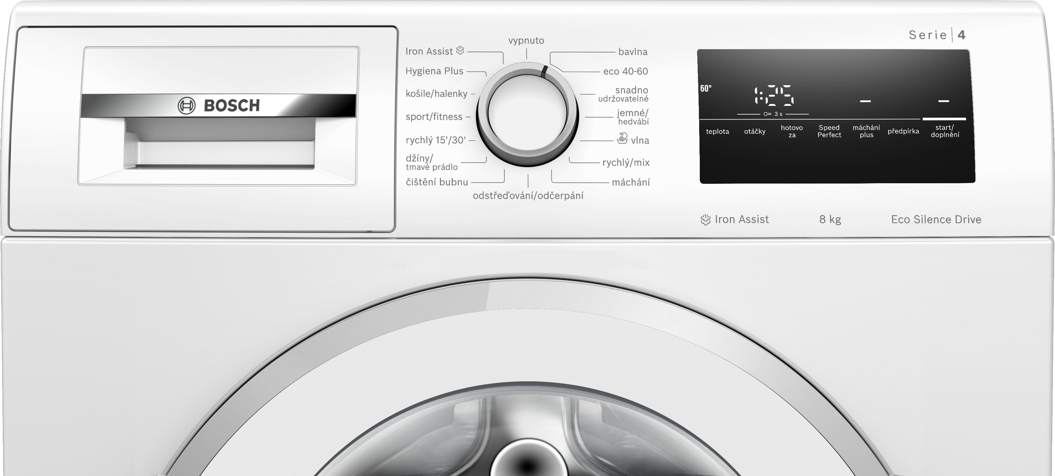 LED displej s ukazatelem zbývajícího času a nastavení konce programu až za 24 hod., ukazatel průběhu programu a speciálních funkcí