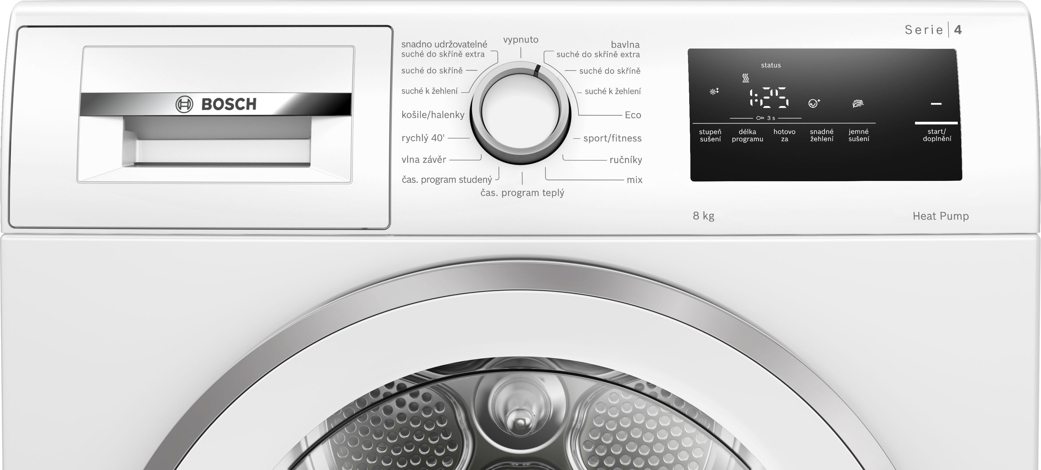 komfortní nastavení sušicích časových, senzorových a speciálních programů plně elektronickým otočným voličem