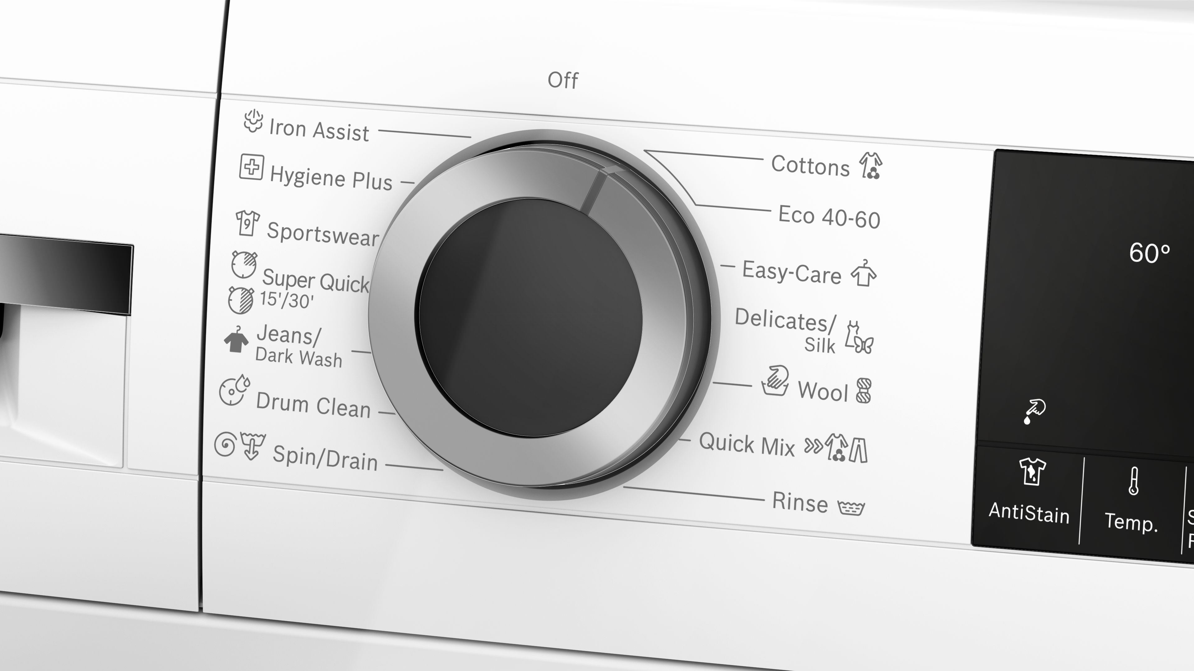 speciální programy: čištění bubnu s funkcí připomenutí, Iron Assist, Hygiena Plus, džíny/tmavé prádlo, odstřeďování/odčerpání, rychlý/mix, sport/fitness, máchání, super rychlý 15/30