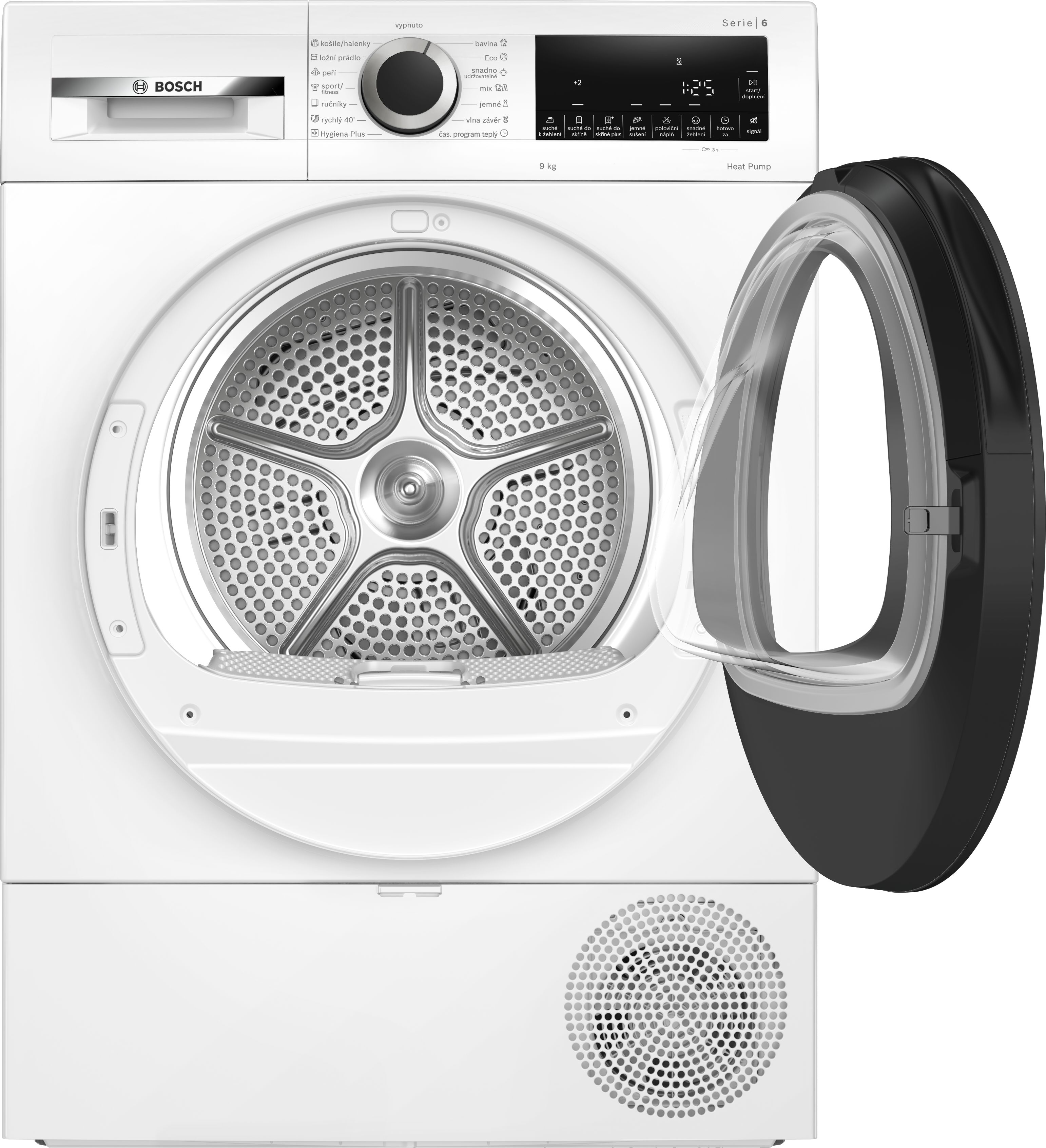 velký LED displej: ukazatel zbytkového času, nastavení konce sušení až o 24 hod., ukazatel průběhu programu, speciální funkce