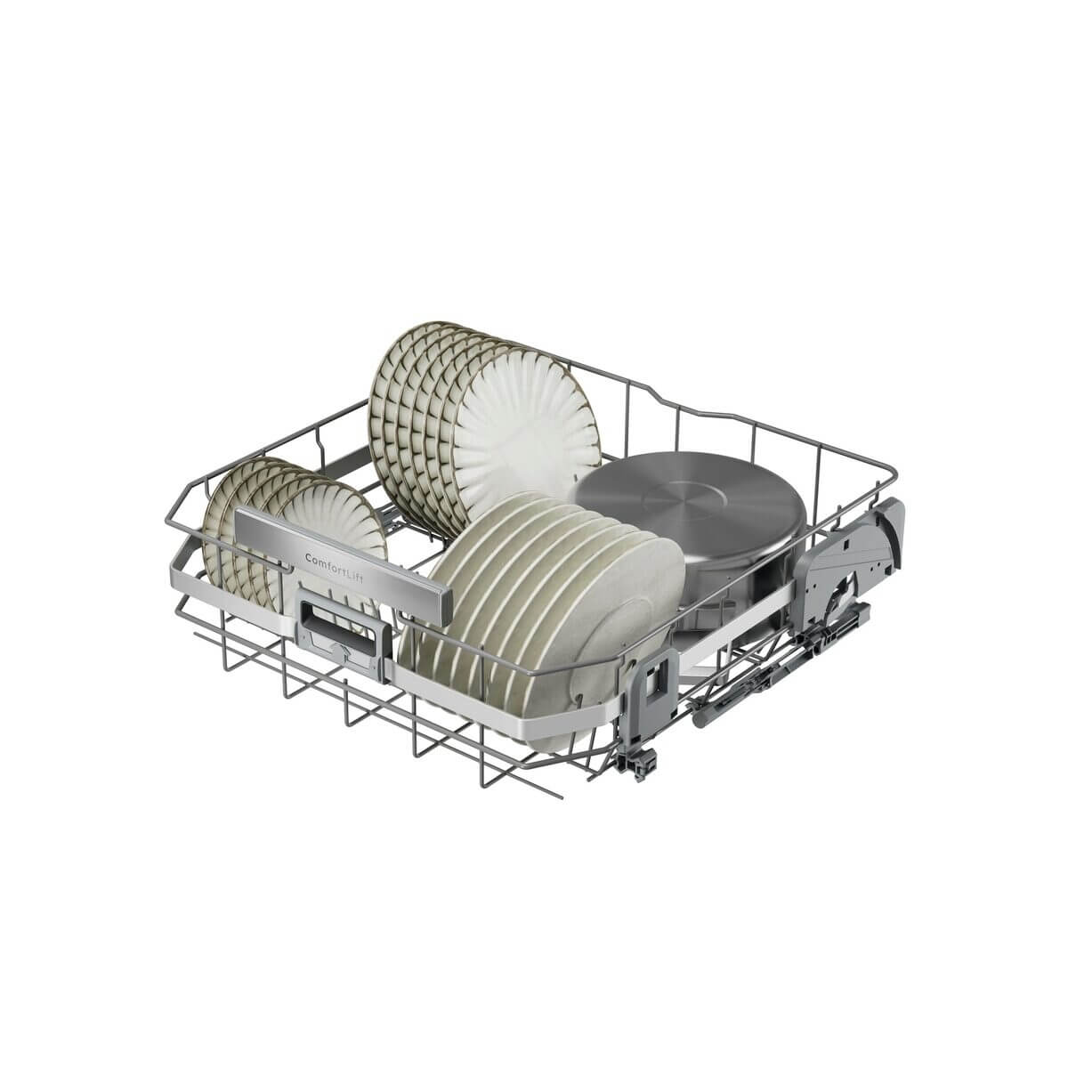 Vlastnosti dolního koše: Tall flat rack frame ComfortLift,4 rear foldable tines with tine caps,stainless steel handle