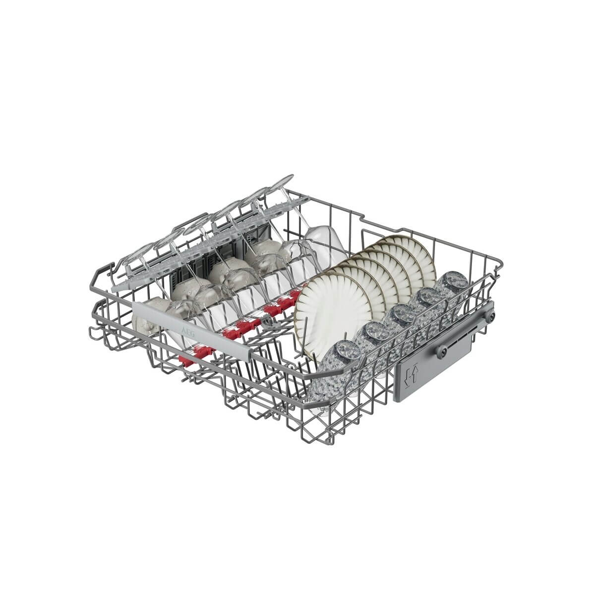 Horní košík má 2 front folding tines for glasses with tine caps, 2 front folding tines for saucer with tine caps, 2 měkké špičky, 6 měkkých špiček pro vinné sklenky, skládací poličky na šálky, nerezové držadlo