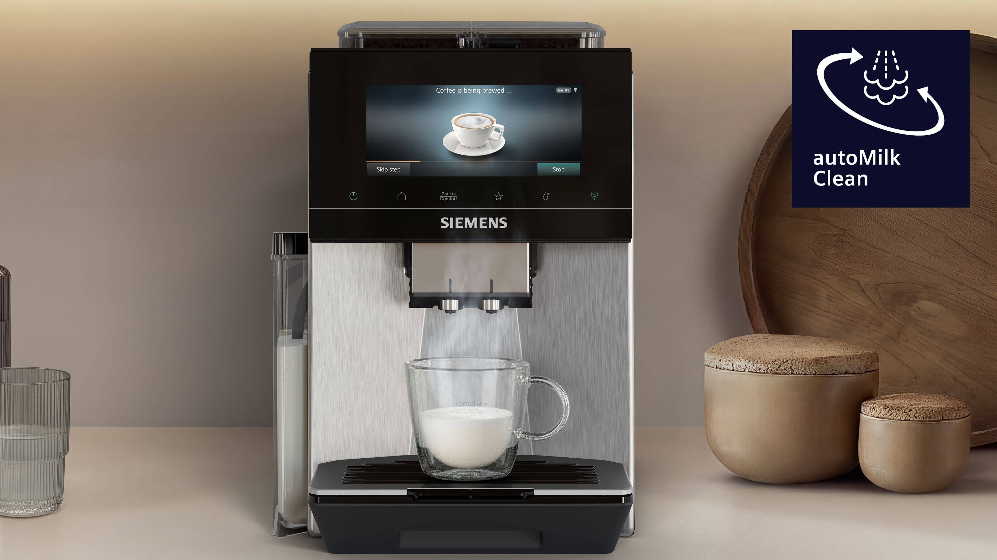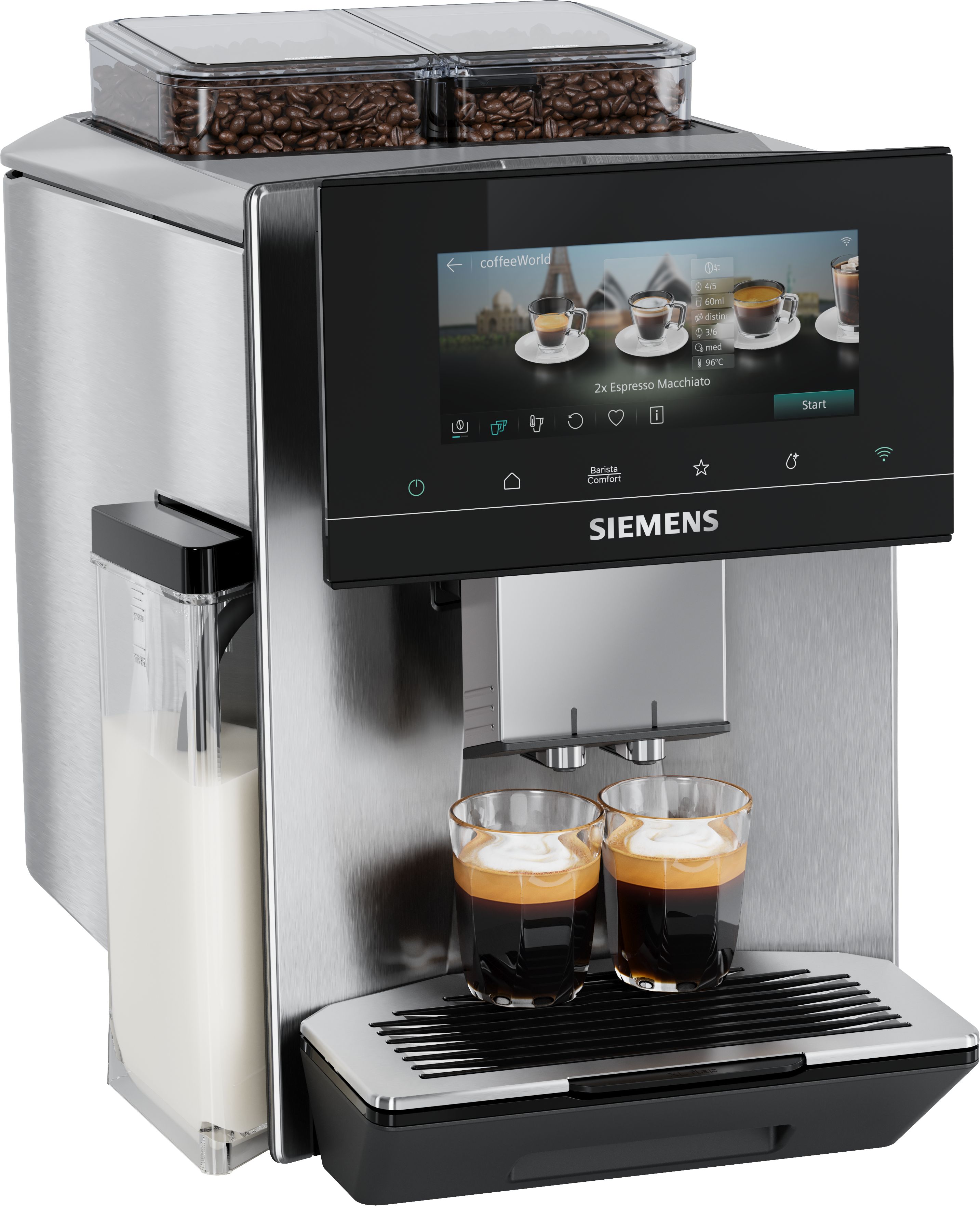 Seznam mléčných nápojů, které je možné získat stisknutím jednoho tlačítka bez pohnutí šálkuLatte Macchiato, Cappuccino, Caffé Latte, Espresso Macchiato, Flat White, Café cortado, Kleiner Brauner, Café au lait, Café con leche, Cortado, Galão, Garoto, Großer Brauner, Kaapi, mléčná pěna, Verlängerter braun, teplé mléko, Wiener Melange, Latte macchiato XL, Cold Brew Macchiato