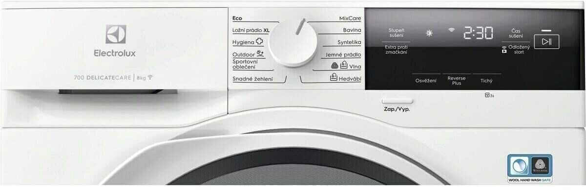 Indikátory fáze sušení pro: suché do skříně, automatické ochlazování po ukončení programu, suché k žehlení, suché do skříně, extra suché, funkce proti pomačkání - konec