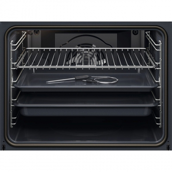 Výbava trouby - plechy: 1 smaltovaný koláčový plech na pečení, 1 odkapávací pekáč šedý smalt